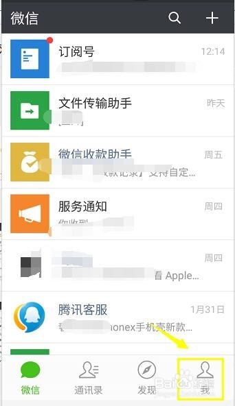 登陆你的微信,在消息页面选择有下角的我进入。如下图所示