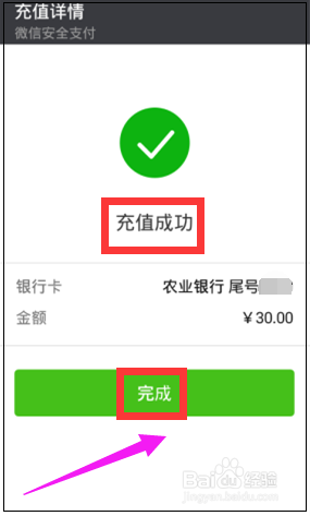 进入充值详情页面,即显示充值成功,点击“完成”。