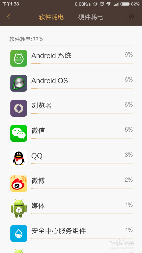 如图所示,软件总耗电比例是38%,在这里可以查看具体软件的耗电情况