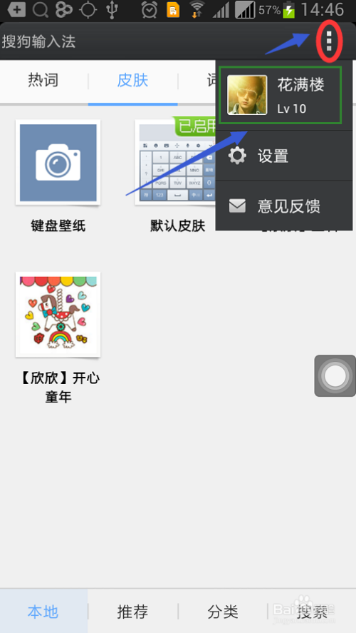 之后使用自己的搜狗账号登录,可以在设置页的“个人中心”里点击登录,登录以后在输入法的首页右上角下拉选项里看到我们的个人头像,如图;在这里笔者要强调一点,必须是登录账户才能进行记忆词库的同步、清除等功能