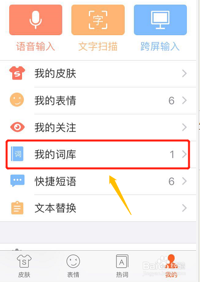 此时我们就能够看到"我的词库"选项了,打开此项我们可以同步用户词库,当然如果是想清除记忆词库的话,那么点击下方的"清空用户词库"即可,如图所示...