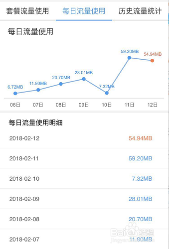 要每日流量的话点击每日流量使用,可以看到每日的流量使用情况,一般如果偶尔使用,一点基本上也要几十M,这个大小跟自己的使用习惯。