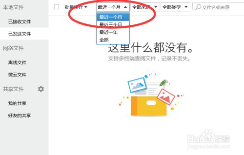 在文件助手的页面我们可以先要查找的是我们接收或者传送的文件,然后在上方的时间里选择时间。这里默认是选择一个月的。