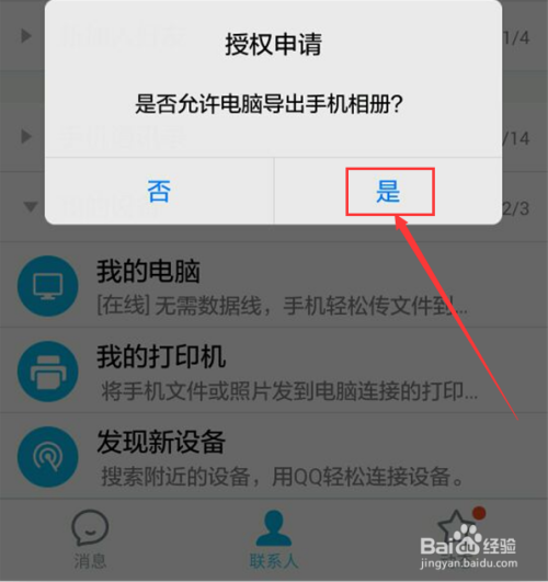 当电脑上点击导出手机相册时,手机的QQ上会有收到一个授权申请的提示,点击【是】即可。