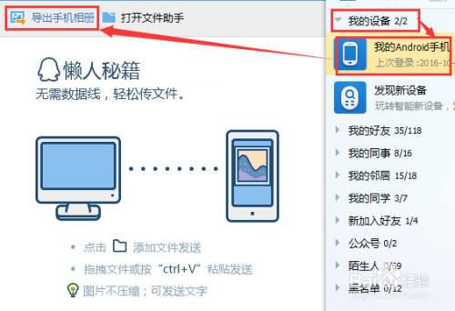 在电脑上【登录自己的QQ号】然后在QQ面板中,点击【我的设备】——【我的Android手机】——【导出手机相册】。
