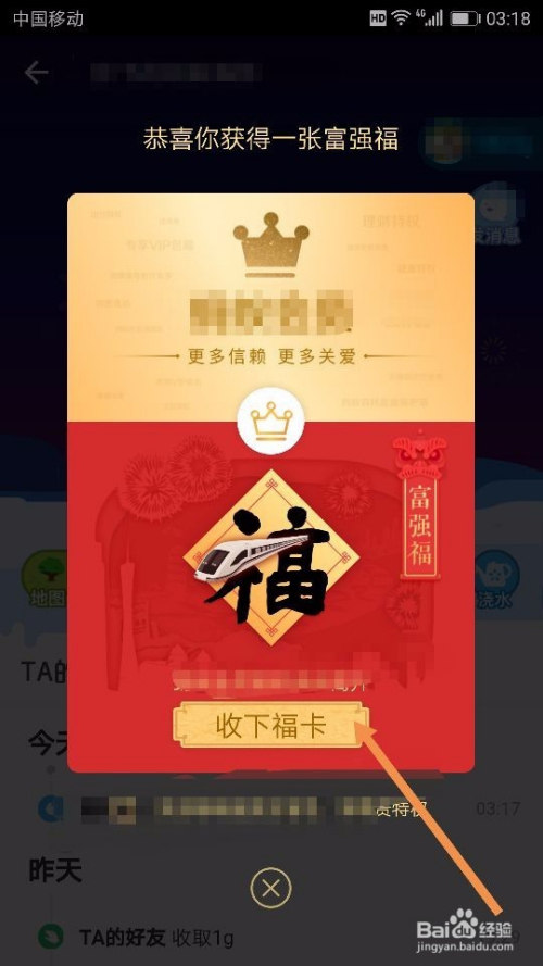 可以看到“浇水领福卡”的活动介绍,大致意思是在活动期间,我们可以给好友浇水或者合种树浇水,我们就有机会得到一张福卡,如图所示~