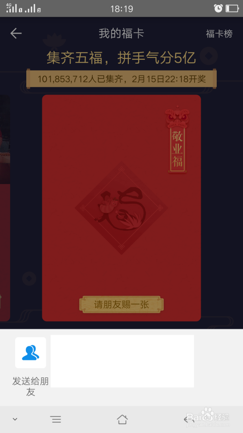 选择一个自己没有的福卡,点击请朋友赐一张弹出个列表,发个朋友方式