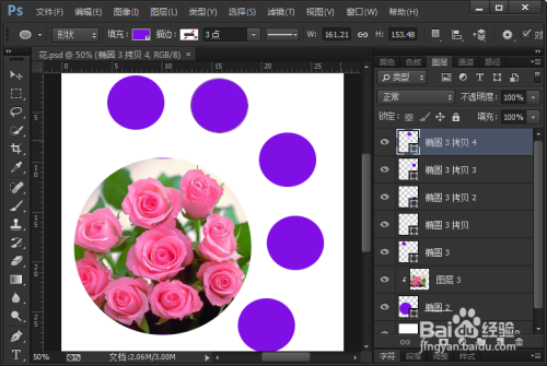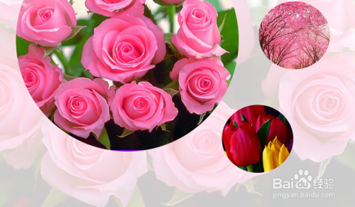 使用同样的方法,再画出一个小圆的图形,然后再复制几个小的图形,来衬托大圆形的花朵,看起来更的饱满一些。然后使用以上的第五个方法,把小图形中插入图片即可完成。