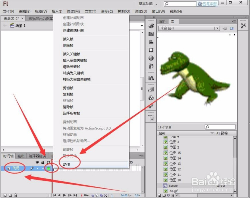 将图层命名为“代码”, 在图层的第1帧右击,选择“动作”选项。