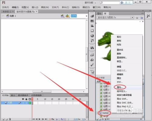 在元件上右击,选择“属性”,选择“为ActionScript导出”,将“类”名取名为“cursor”。