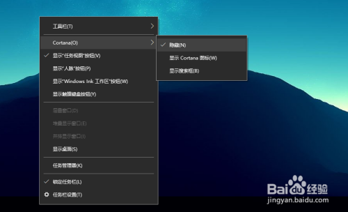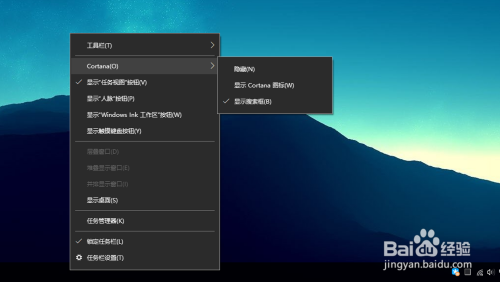 选择菜单中的cortana,此时会弹出一个菜单,默认是“显示搜索框”,如下图所示: