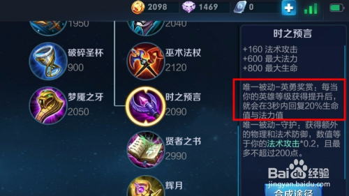 由于杨玉环前期非常容易被敌方刺客盯上,因此第一件出装建议出“时之预言”。