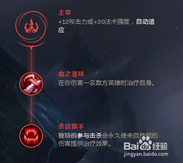 副系选择的是‘主宰’,‘血之滋味’配合‘贪欲猎手’让其在前期拥有一定的恢复血量的能力;