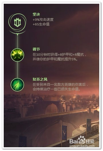 选择“坚决”作为“副系符文”(耐久和控制)。在副系符文1中选择“调节”,提高暴怒骑士的双抗;在副系符文2中选择“复苏之风”提高暴怒骑士在线上的回血能力。