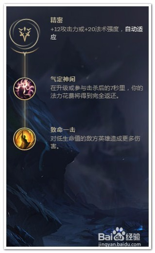 选择“精密”作为“副系符文”(强化攻击和持续伤害)。在副系符文1中选择“气定神闲”,触发符文效果回蓝,可以无限POKE;在副系符文2中选择“致命一击”提高对残血英雄输出,后期吉格斯技能碰到AD基本上就能使其残血。