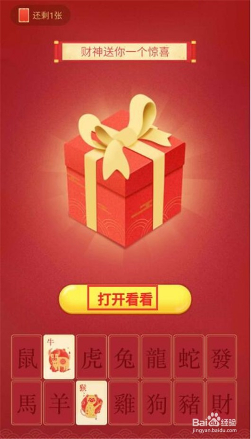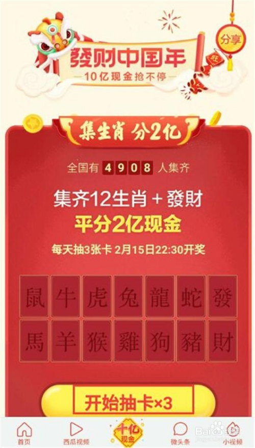 先玩第一个,集齐12生肖,再加一个发财狗和一个旺财狗,就可以获得现金红包奖励,点击“开始抽卡三张”,每天可以抽一次的哦。