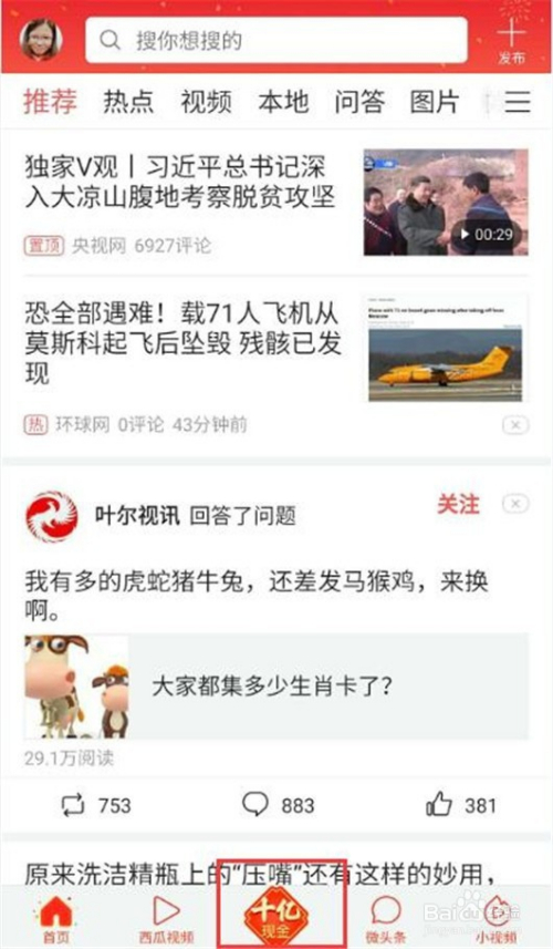 打开今日头条APP,点击中间的“十亿现金”