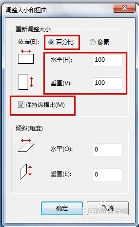 这个时候,你有两种方式来调整图片大小,一种是根据百分比,另一种是根据像素。我们先来看看百分比如何应用,首先,选择百分比选项;然后水平和垂直选项默认值是100,假如你设置为50,就是调整50%,也就是图片会缩小一半。假如你选择150,就是调整150%,图片会扩大1.5倍。百分比的缺点就是你不能判断缩小后图片的尺寸。“保持纵横比”的选项下面讲解。