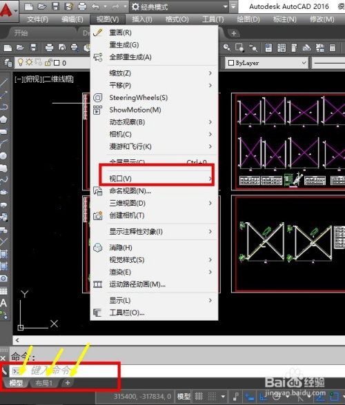 其中视图选项中视口,选择左下方布局时,图纸以布局显示,绘图区中显示有线框的便是一个视口。在+号处,也可以新建布局。