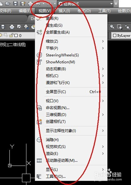 菜单栏中视图选项,视图选项包含图形的缩放、平移、视口、视觉样式、渲染、显示等命令。