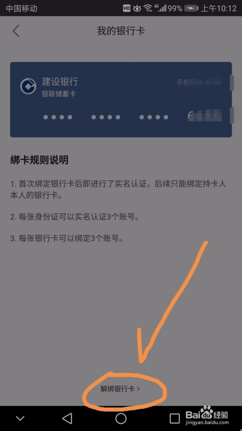 进入我的银行卡后,可以看到我已经绑定的银行卡,点按界面下方的解绑银行卡标志。
