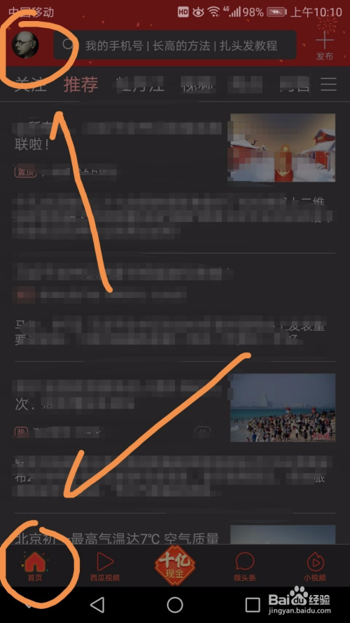 进入今日头条后点按界面左下方的首页标志,然后点按界面左上方的头像标志。