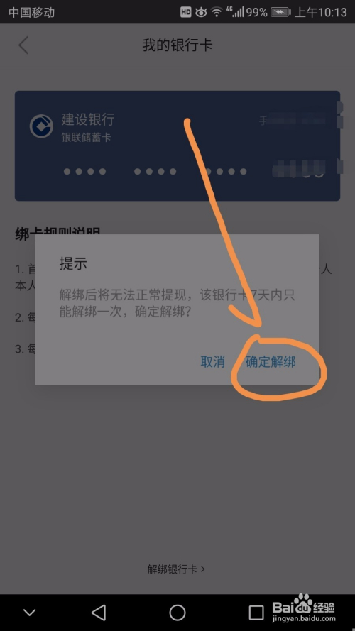 此时会弹出提示框提示解绑后无法正常提现,该银行卡7天内只能解绑一次,确定解绑。直接点按确定解绑即可。