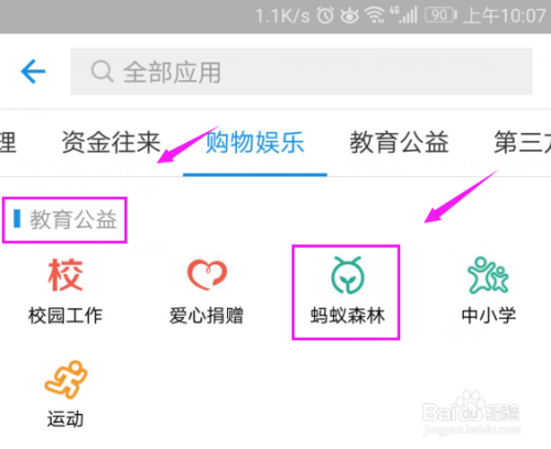 来到更多,我们需要找到蚂蚁森林,这里,其实也很容易找到,先找到教育公益,蚂蚁森林就在这里,如图。