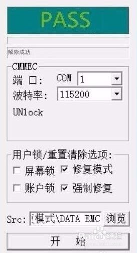 6.点 开始 按扭开始操作.成功后会显示PASS下方为解除成功