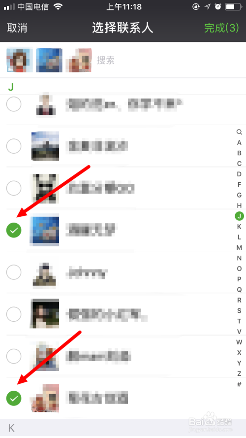 在出现的“选择联系人”界面中找到想要添加到微信群里的朋友,并在前面的圆圈中打钩。当然,别忘了把自己添加上。