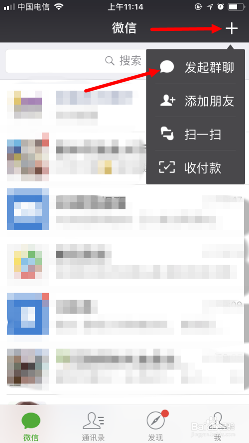 然后点右上角的“+”,在出现的下拉菜单中点“发起群聊”。