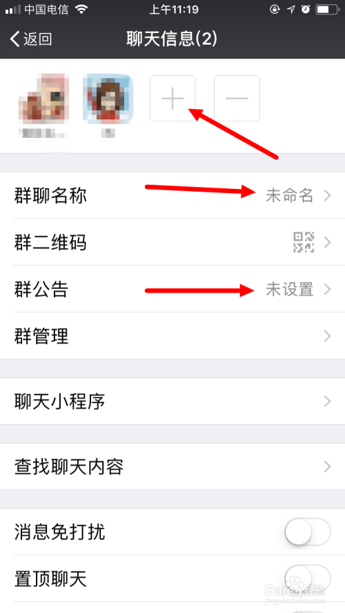 在出现的界面中,点上方“+”的地方可以添加新的朋友进入微信群;点“群聊名称”可以设置这个微信群的名字;点“群公告”可以写一些微信群的规则和纪律等。