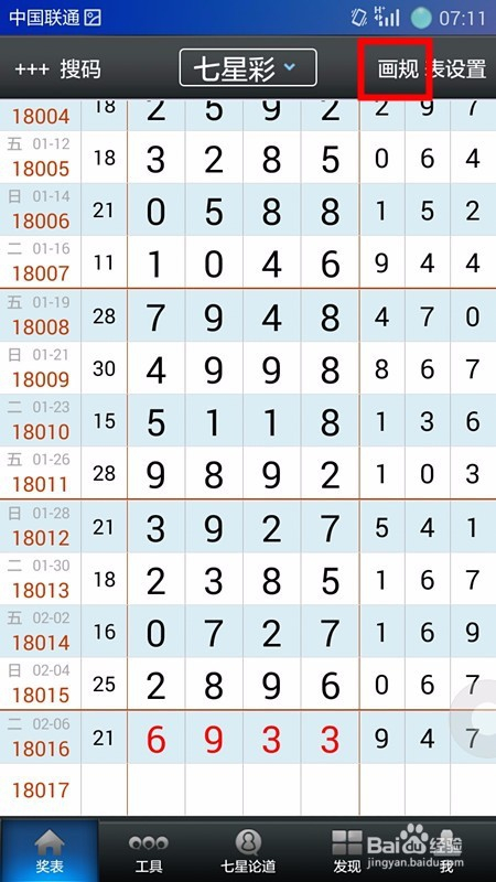 在打开的软件首页中,我们可以看到七星彩表,我们选择该页面的“画规”选项;