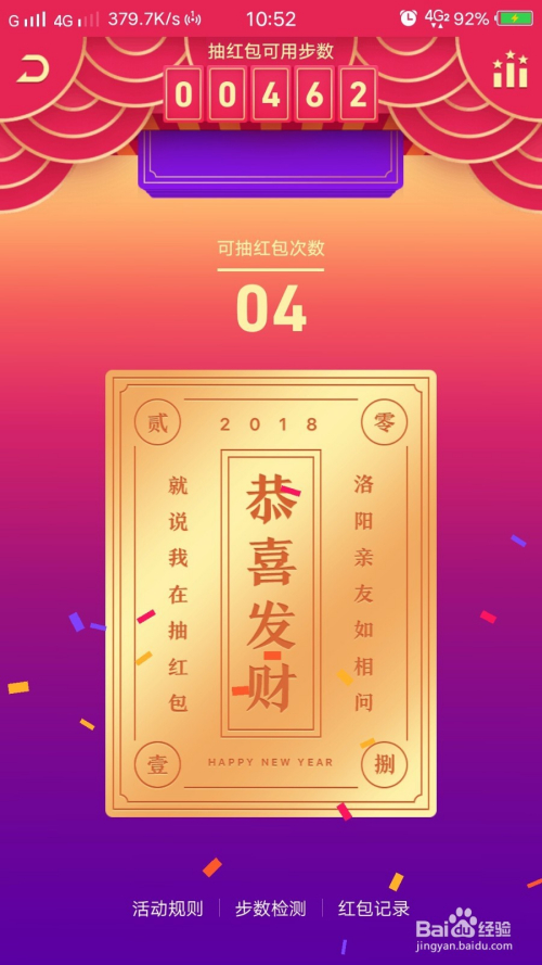 可以看到我今天才走了100多步,点击那个红包,进入里面,可以看到我获得了5次抽红包的机会,加上我走的100步就是六次