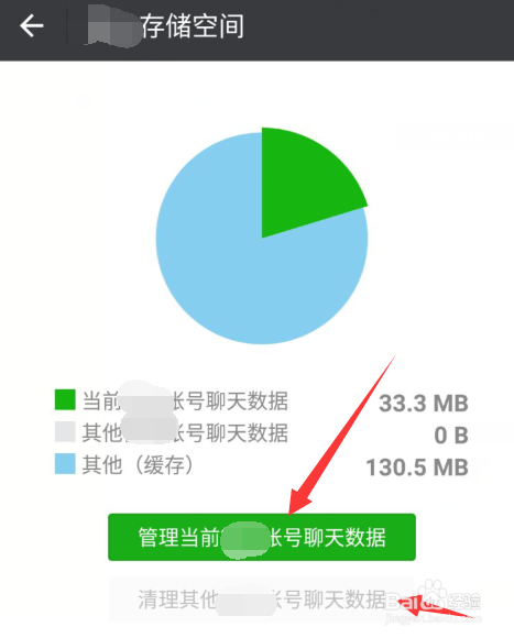 接着进入下图所示界面,点击界面上方管理存储空间按钮,即可进入存储空间占用详情界面,查看当前登录帐号聊天记录占全部记录的百分比。