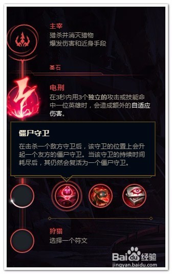 在三个追踪里选择”僵尸守卫“。提高视野控制率,防止前期被GANK,影响发育。