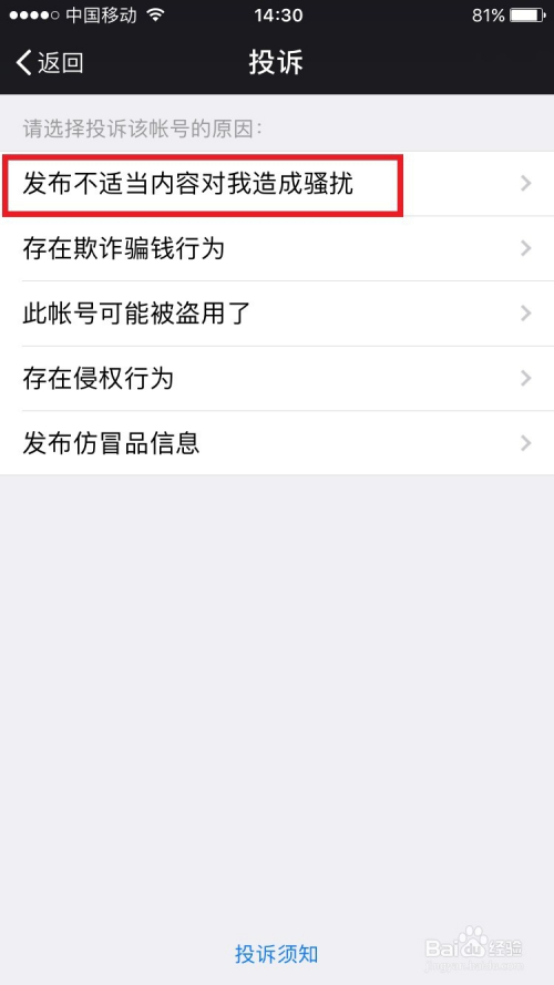 接着进入到投诉的设置窗口,在这里选择投诉的原因,选择第一个发布不适当内容的选项,如图所示: