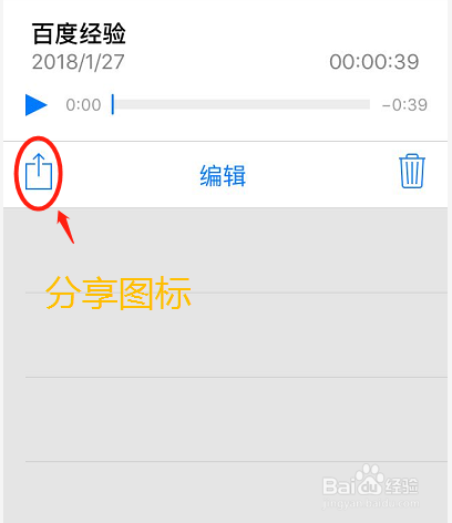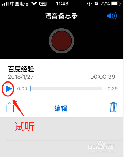 点击刚才录制的音频文件,我们可以试听录制效果,还可以通过"编辑"对刚才的录音内容进行剪辑,如果整体都不满意那么直接在以上的试听页面点击右下角的垃圾箱图标将其从手机里删除即可;