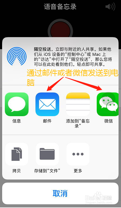 如果想要将此音频上传到电脑应该如何操作呢?同样在试听界面,点击左下角的分享图标,我们可以选择邮件、微信等传输方式将其发送到电脑上,如图...