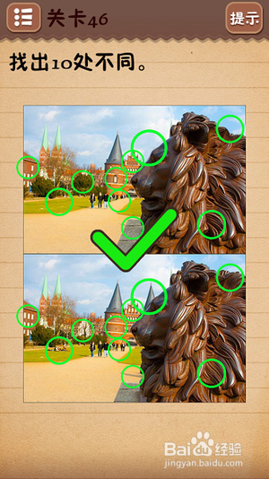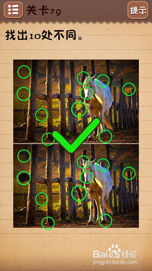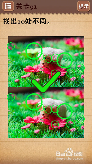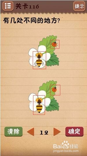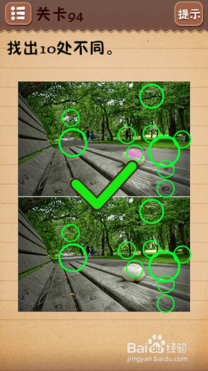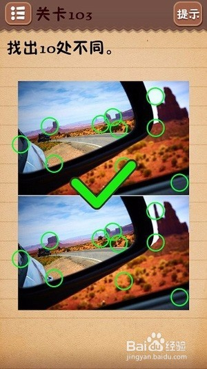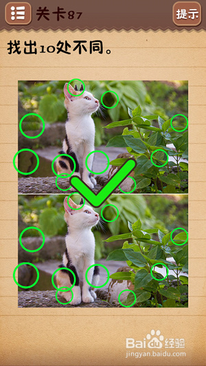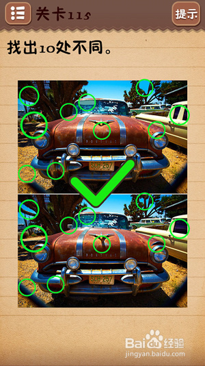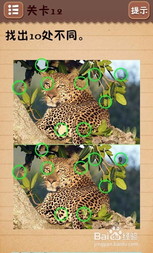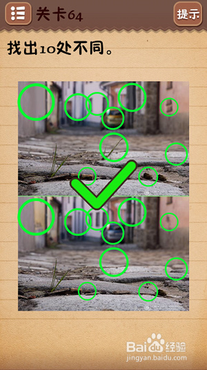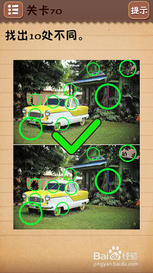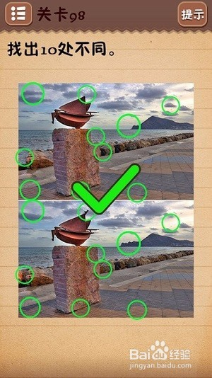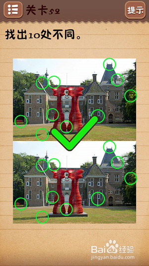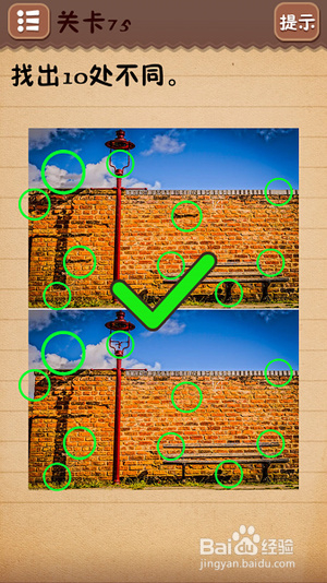 第十一关把6下面的○拉到正中间;第十二关找出10处不同(看下图);第十三关把绿色箭头放到开关上;第十四关把房子拉到“什么”二字上面;第十五关在每个瓶子标签上摩擦找到雪碧;