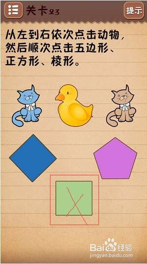 第二十一关输出当前手机上的时间;第二十二关用两个手指同时按住红色线头;第二十三关不要按顺序点击,请注意菱形和正方形都是蓝色那个图形,下面那个浅绿色的是长方形;第二十四关把钻石中间部分拖动到粑粑下面,然后点击甜筒;第二十五关把“大公鸡”三个字拖动到烤箱中;