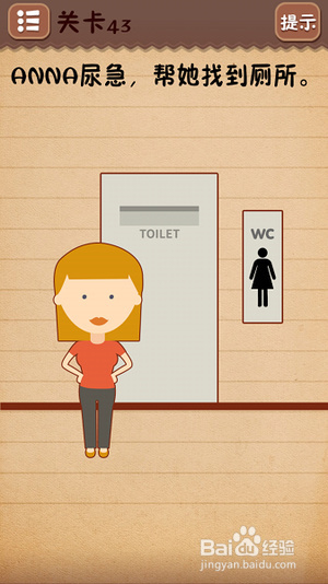 第四十一关把房子拖到题目的“房子”二字上面;第四十二关点击红色十次,然后点击finish,注意不要看假计数;第四十三关摩擦男厕所标志变为女厕所;第四十四关把云拖到太阳上面;第四十五关点击题目中的“脑袋”二字;