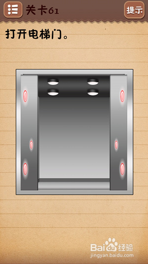 第六十一关快速点亮电梯门上的所有灯(六个);第六十二关擦掉等式里的“蜂”字;第六十三关把最大的球放到第四个位置,使扔球顺序变为中、小、大;第六十四关找出十处不同(看图);第六十五关先点击左边的红色按钮使小球到顶,然后再点击右边的红色按钮使小球到顶;