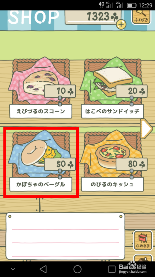 ①.点击屏幕右下角的【一蓝一白两个包袱】的图标,这个是商店,点开以后就能看到我们可以购买的商品了。商店的第一页就是食物,里面有可供我们购买的面包了,一共六种,价格从10草到100草不等。