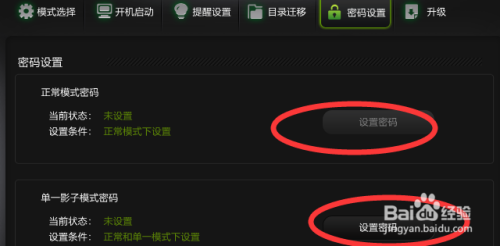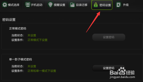 在主界面的模式菜单下我们需要点击偏右边的密码设置按钮跳转到密码设置的页面。