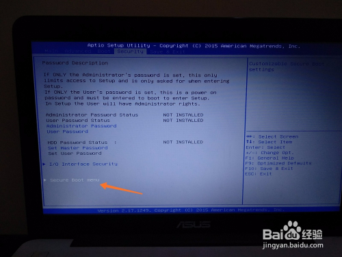 如图,进入bios后,右移至security,下移至secure boot menu。回车进入。
