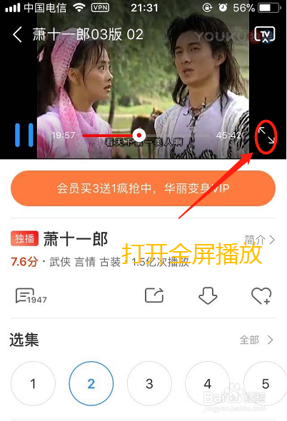 接着在弹出的设置窗口,我们将"跳过片头/片从头至尾"这一选项封闭失落;或者同样是打开某一段视频,在播放窗口选择全屏播放,如图;