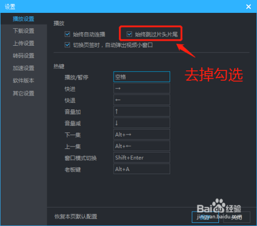 然后在设置窗口界面,我们将"始终跳过片头片从头至尾"中系统默认的勾选去失落,或者在视频播放界面的右下角找到设置图标,点击今后在弹出的对话框将跳过片头片从头至尾的选项封闭即可,如图所示;