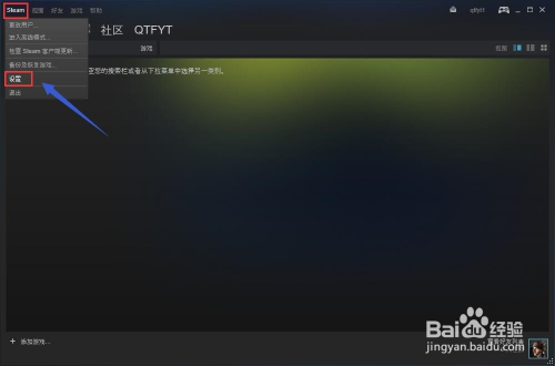 进入steam客户端后点击左上角的steam--设置,如下图所示