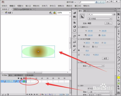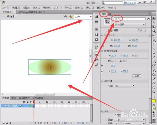 将图层1重定名为“影片剪辑元件”,把椭圆元件拖动到舞台中,在属性面板中,将椭圆的实例名称取名为“elli_mc”。